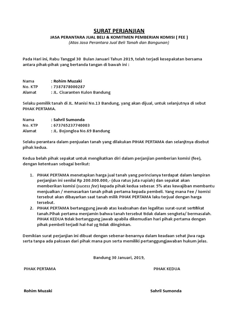 Sebaliknya, pembeli wajib memberikan uang dengan harga barang yang dibeli kepada penjual dengan kesepakatan antara dua belah pihak. No ktp selaku yang menrima pernyataan komitmen fee yang disebut sebagai pihak ii menerangkan pihak i berjanji dan menyatakan akan meberikan fee kepada pihak ii dengan ketentuan sebagai berikut. Pada hari ini, tanggal (tanggal, bulan, tahun), kami yang bertanda tangan di bawah ini demikian surat perjanjian ini dibuat atas persetujuan kedua pihak, yaitu pihak pertama dan pihak kedua, secara musyawarah dan mufakat serta dalam. Jual beli properti seperti rumah memang memerlukan langkah hukum yang jelas dan tepat. Contoh surat perjanjian ini berisi penyerahan tanah dari penjual ke pembeli serta berhak menerima.