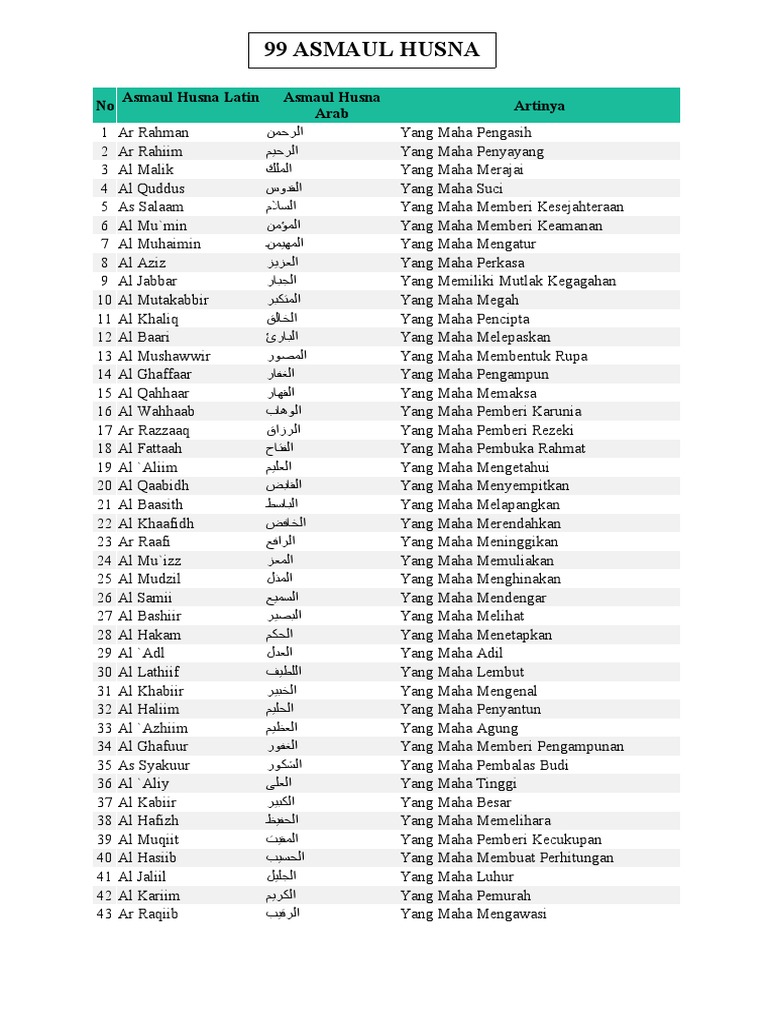 Asmaul Husna Latin - Asmaul Husna Latin / Al malik الملك yang maha merajai 4.. Hadits ini sahih riwayat bukharidan muslim yang berasal dari sahabat abu hurairah radiallahu anhu, bahwa rasullulah bersabda 99 asmaul husna | assalamualaikum wr.wb para sahabat satudoa.com. Itulah 99 asmaul husna latin dan terjemahnya yang bisa menjadi ladang pahala dengan mengucapkannya setiap saat. Sifat allah ini sangat baik diucapkan ketika manusia memohon doa kepada allah. Kumpulan asmaul husna arab, latin dan artinya lengkap, beserta penjelasan setiap asmaul husna asmaul husna sendiri memiliki jumlah sebanyak 99 nama.